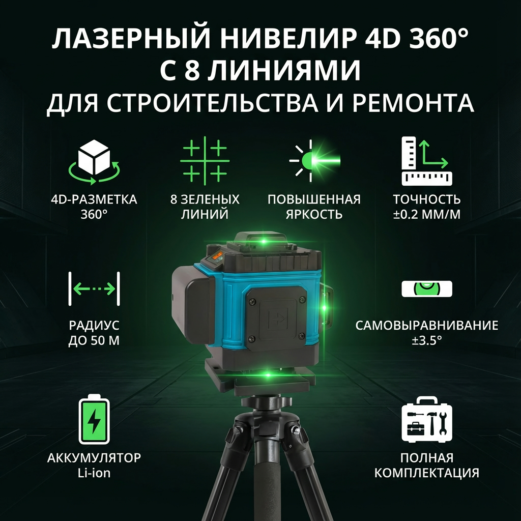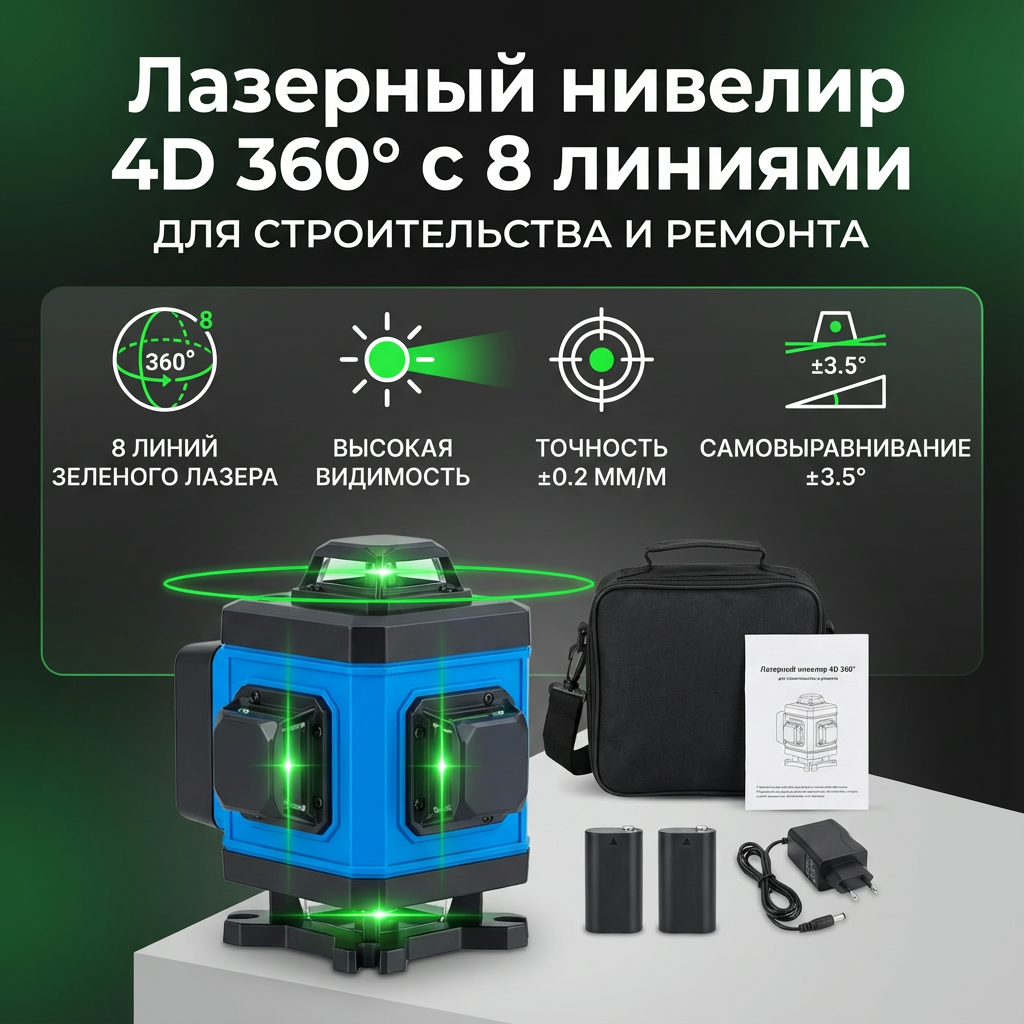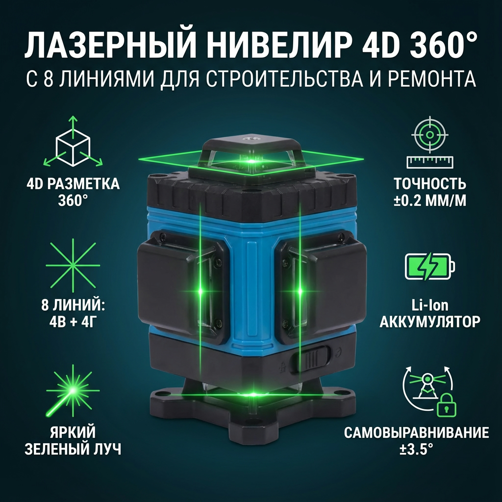 Лазерный уровень 4D 360 — профессиональный инструмент для комплексных строительно-отделочных работ. Его ключевое преимущество — одновременное проецирование до 8 перекрестных линий зеленым лазером, что создает полноценную трехмерную разметку в помещении. Зеленый луч обладает повышенной яркостью и видимостью даже при дневном свете, что ускоряет работу мастеров. Инструмент незаменим для выравнивания стен и потолков, укладки плитки, монтажа перегородок, сантехники, электропроводки и каркасных конструкций, обеспечивая высокую точность и сокращая временные затраты.