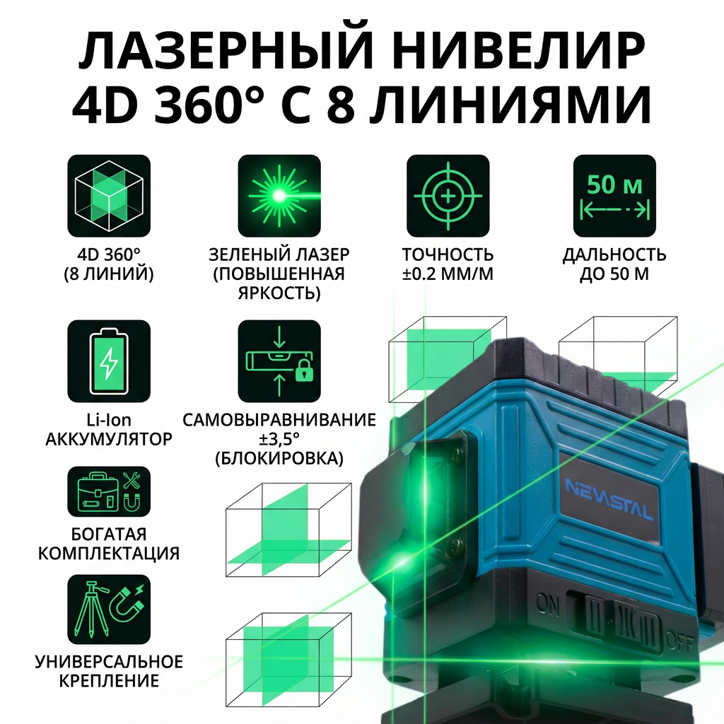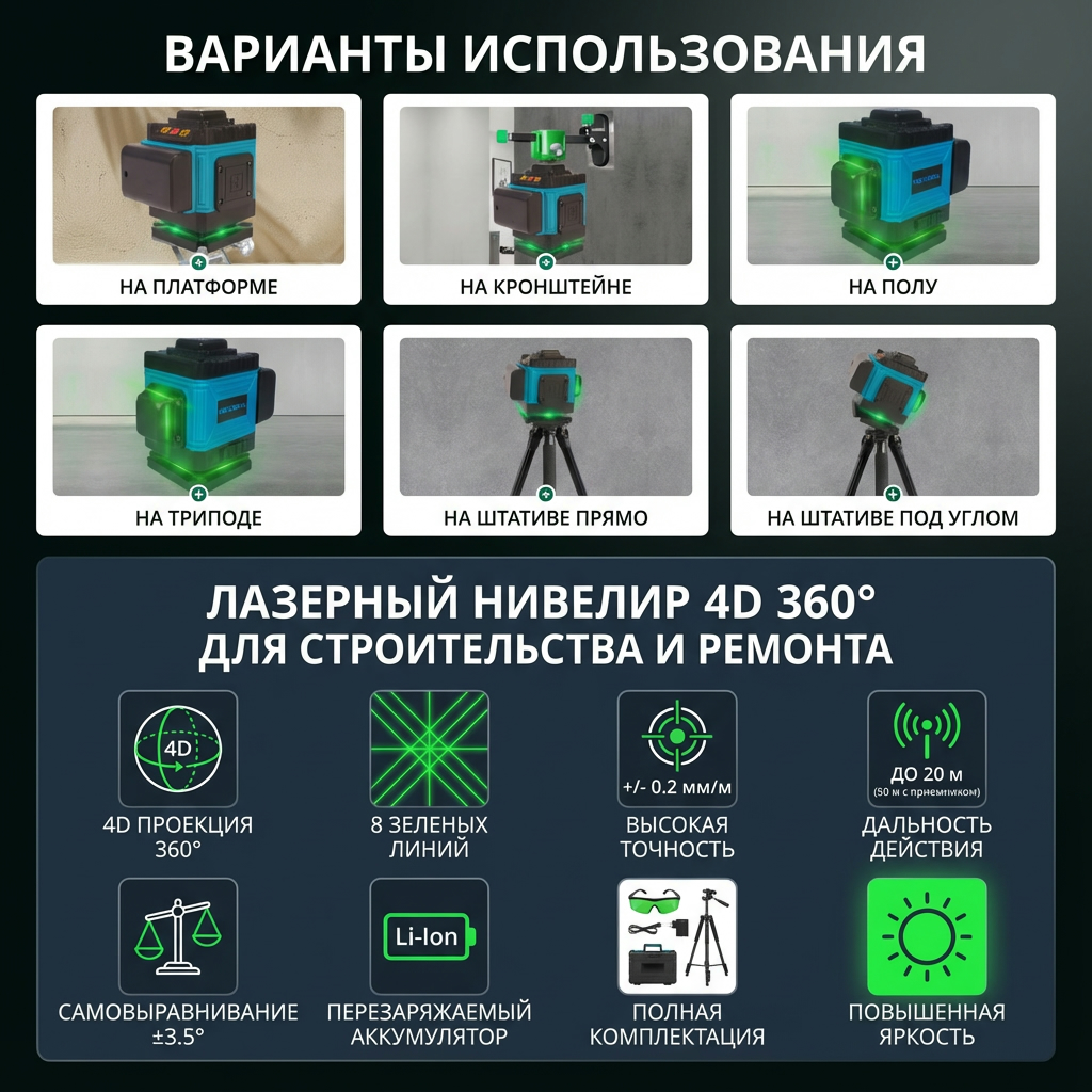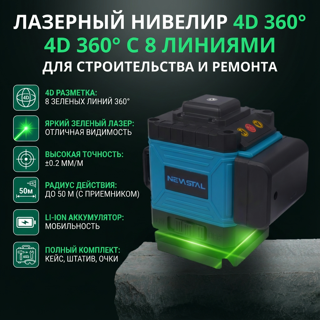 Лазерный уровень 4D 360 — профессиональный инструмент для комплексных строительно-отделочных работ. Его ключевое преимущество — одновременное проецирование до 8 перекрестных линий зеленым лазером, что создает полноценную трехмерную разметку в помещении. Зеленый луч обладает повышенной яркостью и видимостью даже при дневном свете, что ускоряет работу мастеров. Инструмент незаменим для выравнивания стен и потолков, укладки плитки, монтажа перегородок, сантехники, электропроводки и каркасных конструкций, обеспечивая высокую точность и сокращая временные затраты.