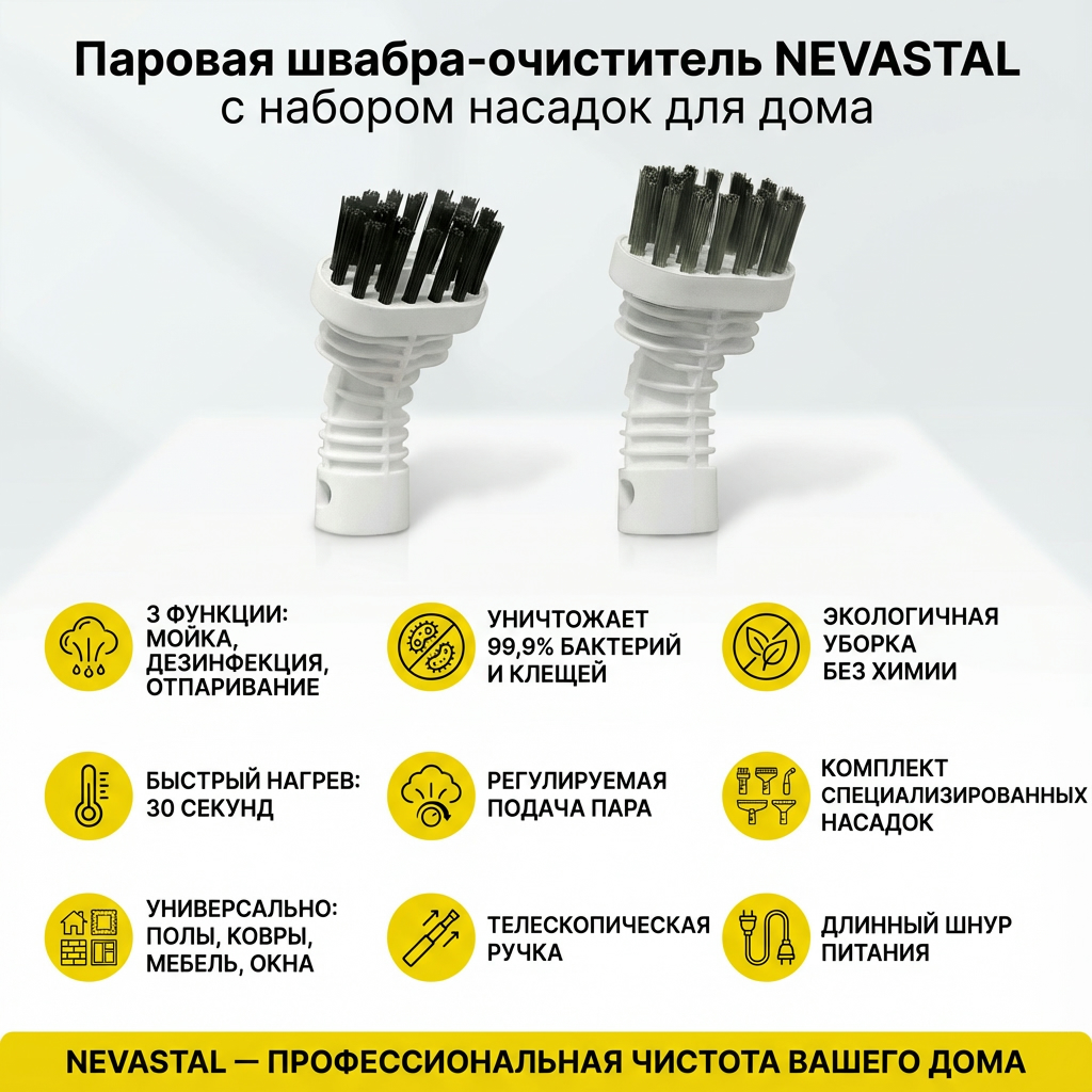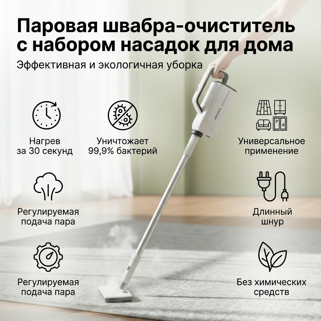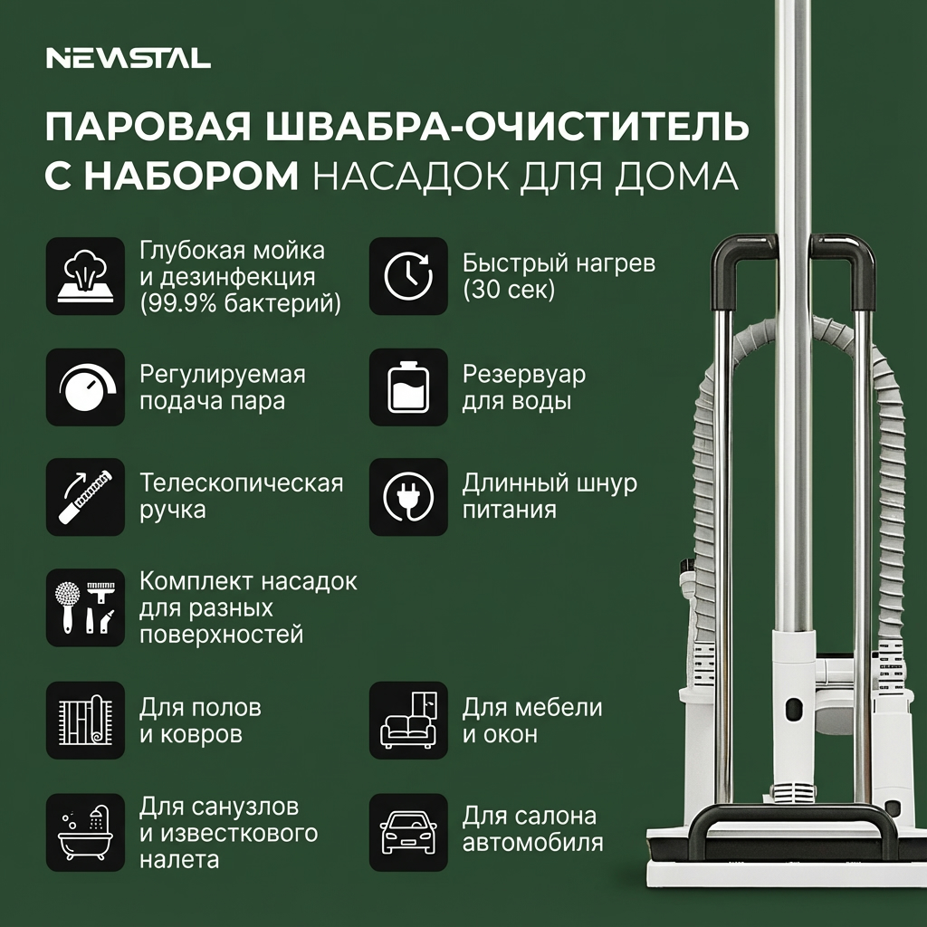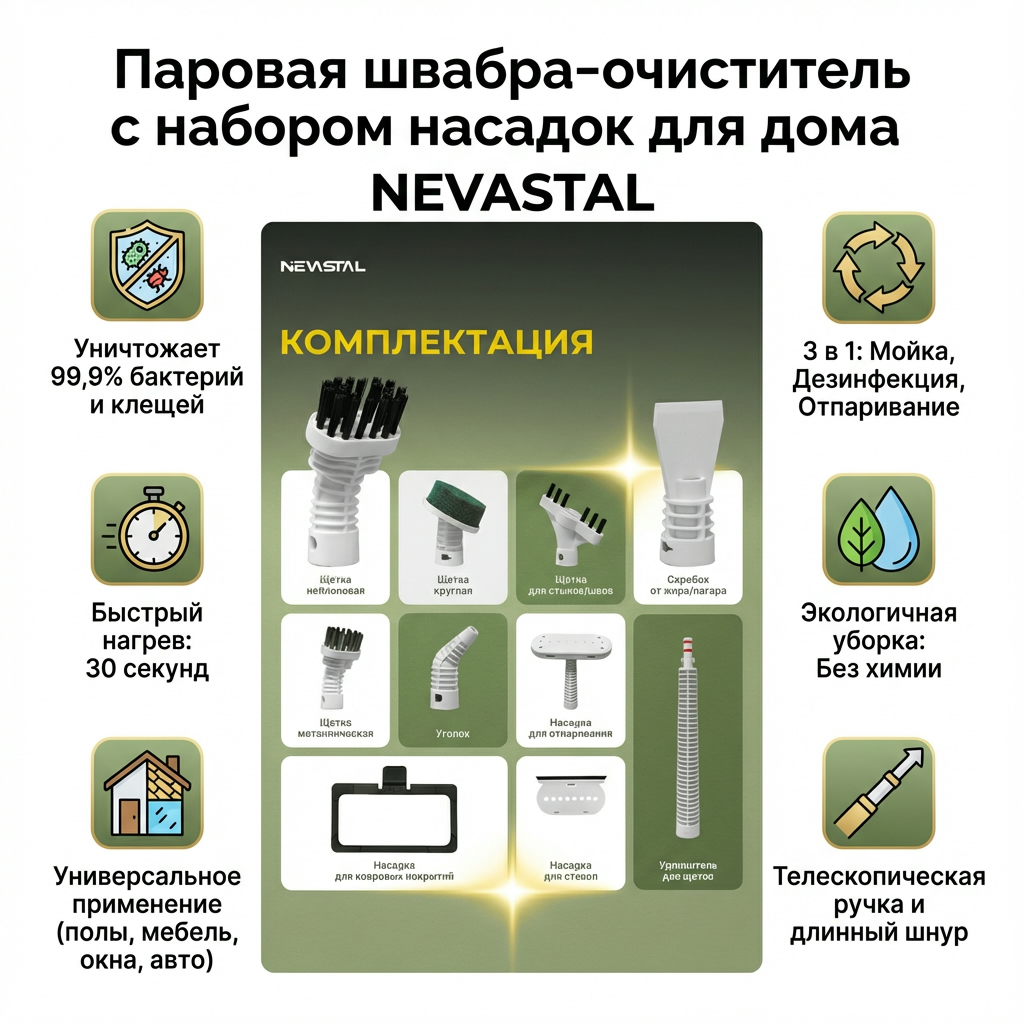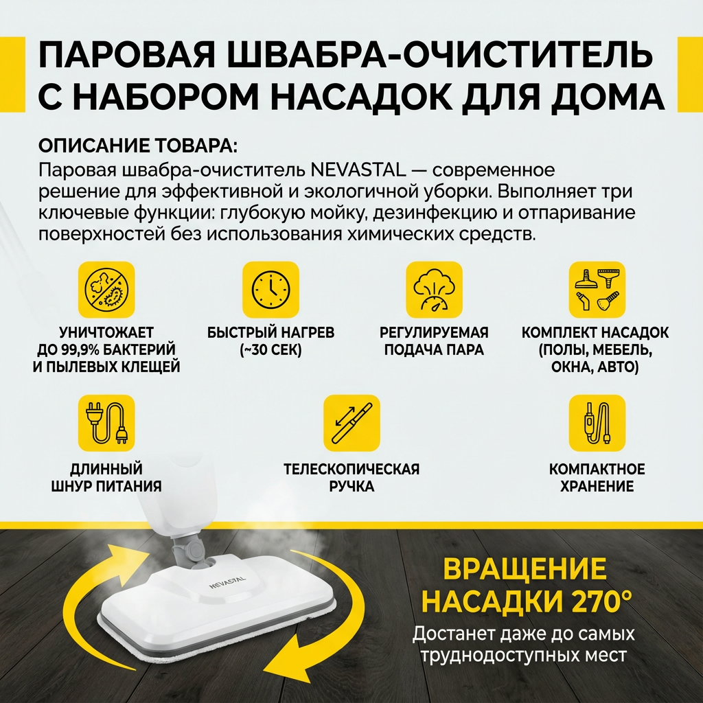 Паровая швабра-очиститель NEVASTAL — современное решение для эффективной и экологичной уборки. Устройство выполняет три ключевые функции: глубокую мойку, дезинфекцию и отпаривание поверхностей без использования химических средств. Горячий пар уничтожает до 99,9% бактерий и пылевых клещей, что обеспечивает гигиеническую чистоту и безопасность для домохозяйств. Это востребованный товар для ритейла, так как удовлетворяет растущий спрос на экологичные технологии уборки и подходит для широкого спектра задач.