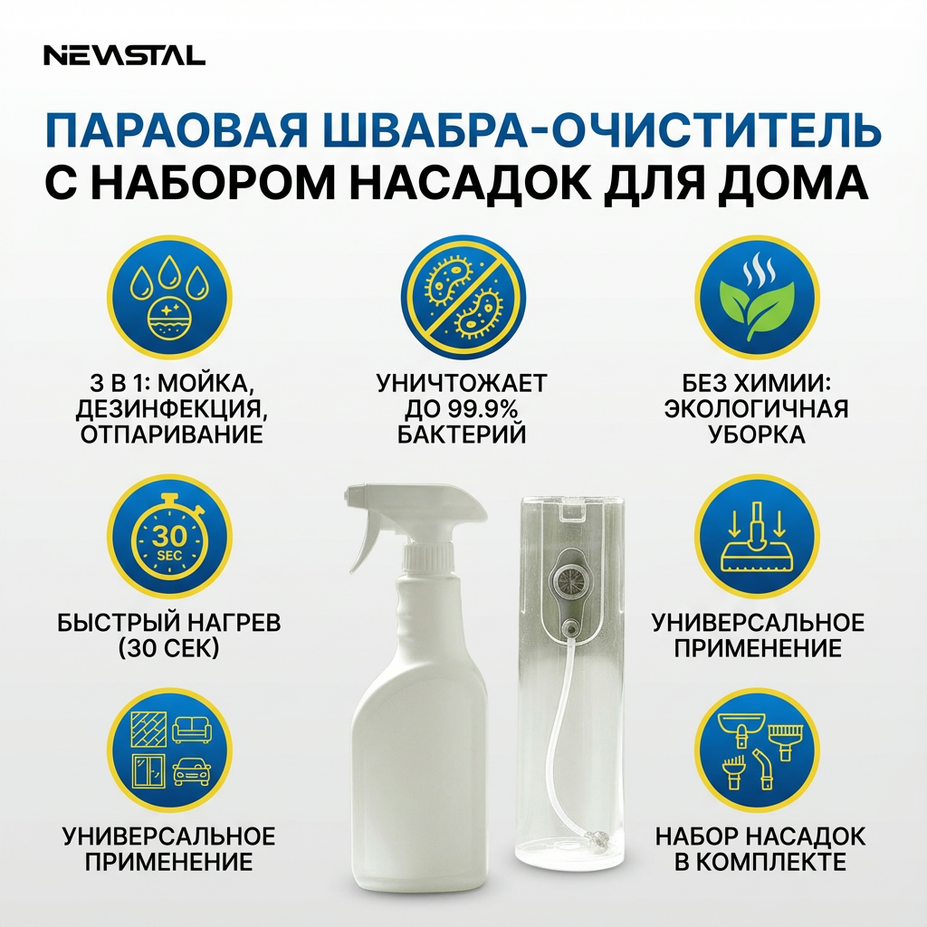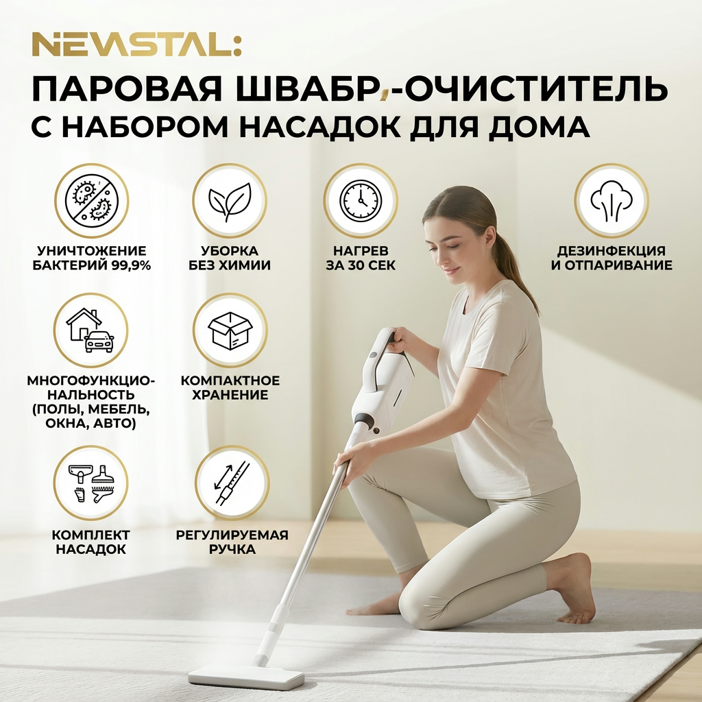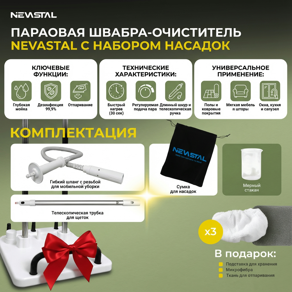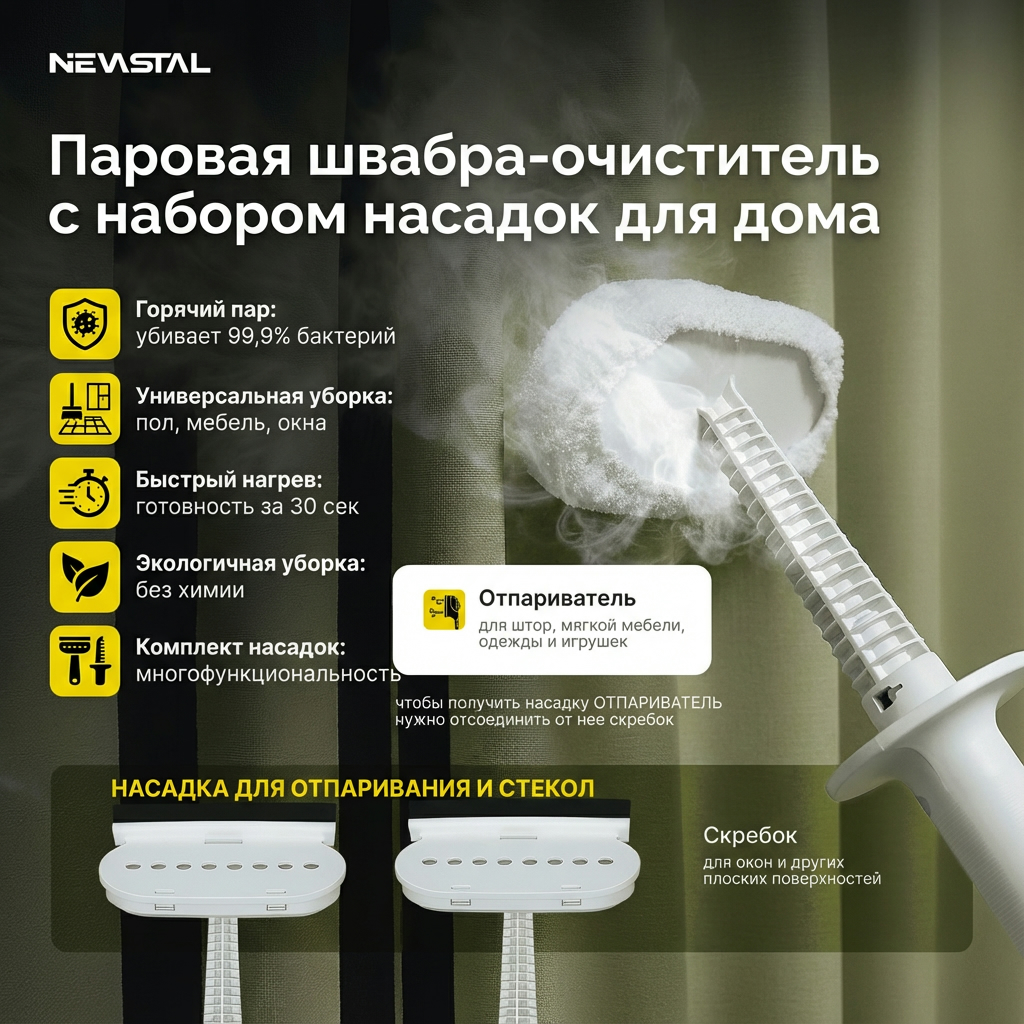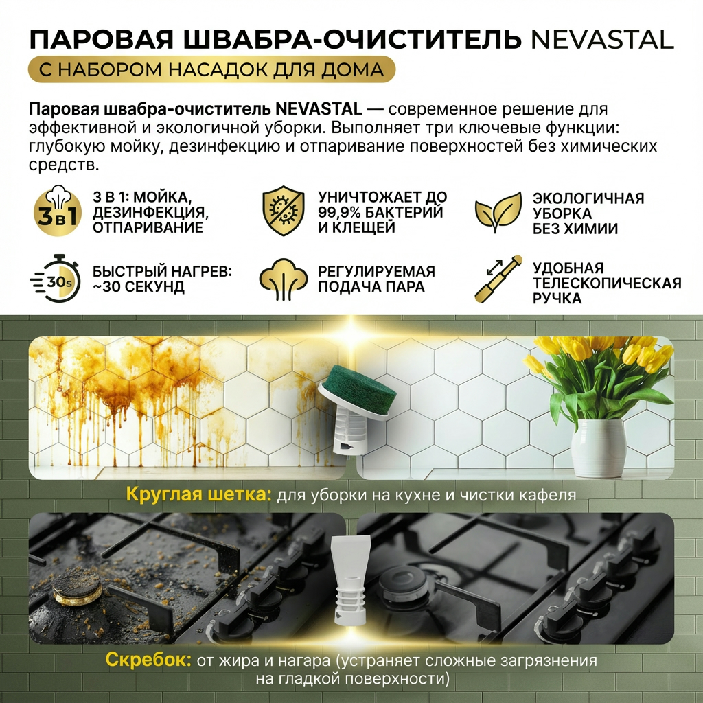 Паровая швабра-очиститель NEVASTAL — современное решение для эффективной и экологичной уборки. Устройство выполняет три ключевые функции: глубокую мойку, дезинфекцию и отпаривание поверхностей без использования химических средств. Горячий пар уничтожает до 99,9% бактерий и пылевых клещей, что обеспечивает гигиеническую чистоту и безопасность для домохозяйств. Это востребованный товар для ритейла, так как удовлетворяет растущий спрос на экологичные технологии уборки и подходит для широкого спектра задач.